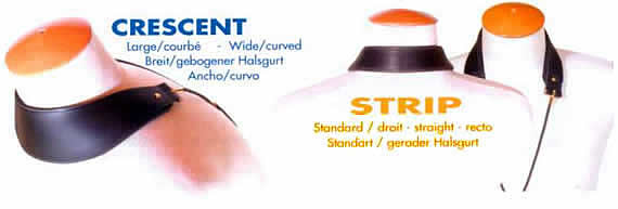 Curved leather neck, neoprene foam + Lycra, no knots cord system, easy and sure adjustment ring, coated steel safety swivel hook.